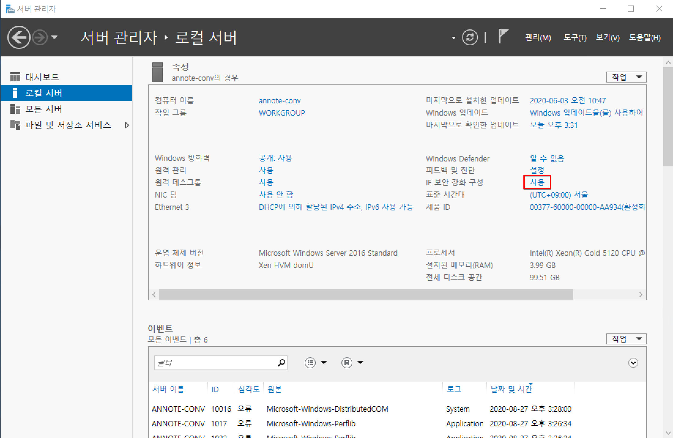 우선 서버 관리자 > 로컬 서버 로 이동하시고 우측을 보시면 IE 보안 강화 구성 이 사용으로 되어 있는 걸 확인하실 수 있는데요. 이것을 클릭하여 설정으로 변경해 주도록 합니다.