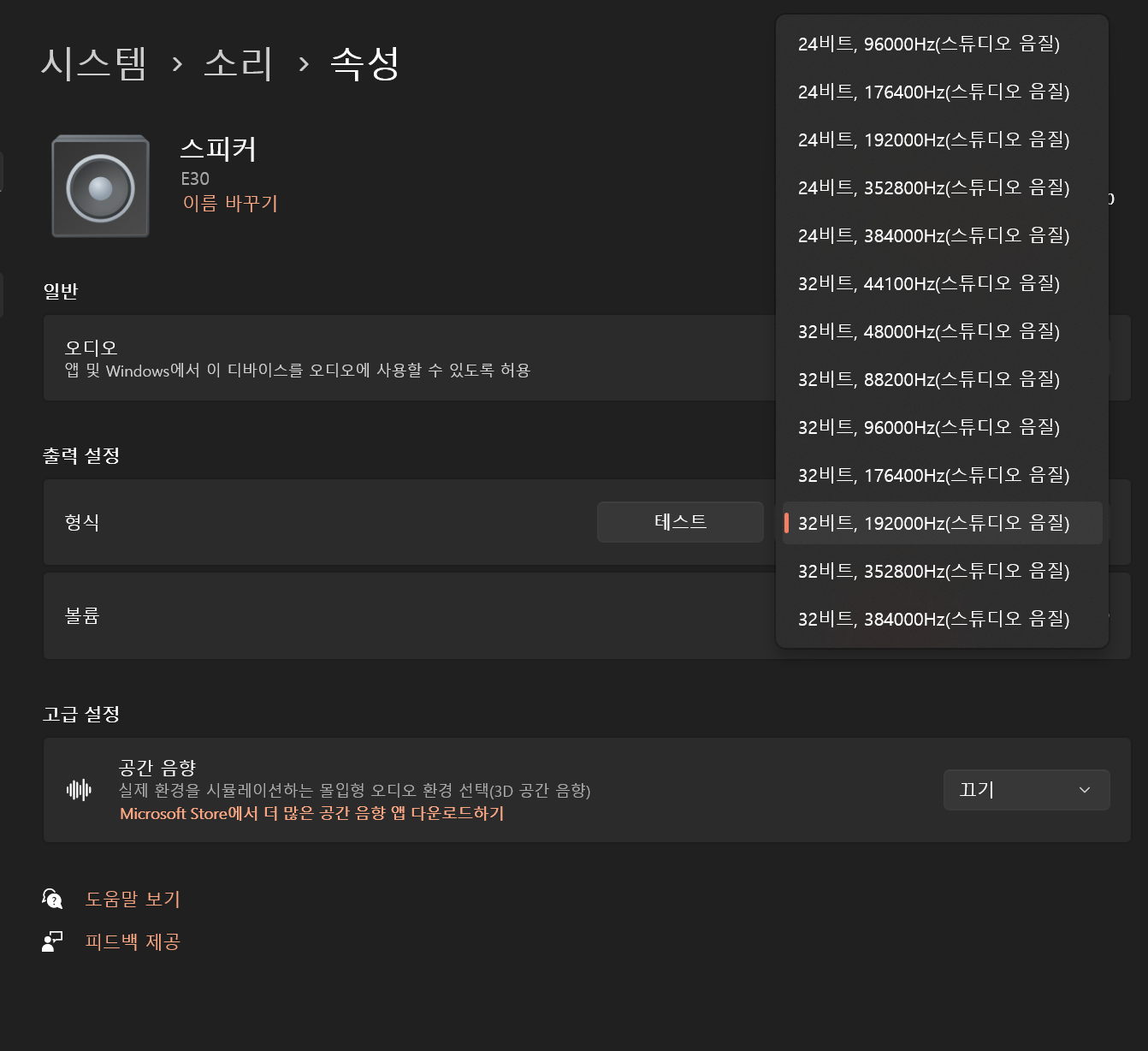 제 경우 32비트, 384000Hz로 해뒀는데 소리가 나지 않았고 해외 스팀에서 찾은 방법으로 192000Hz로 변경하면 소리가 난다는 글을 보고 변경해 보니 바로 소리가 나게 되었습니다.