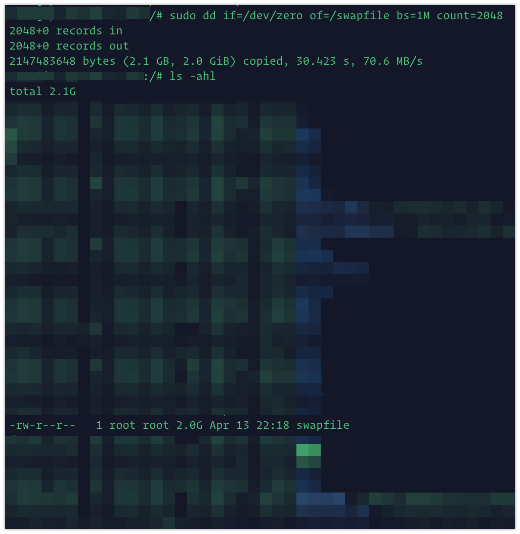 $ sudo dd if=/dev/zero of=/swapfile bs=1M count=2048