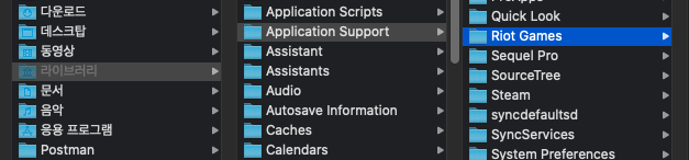 처음 설명드렸던 폴더로 이동을 통하여 ~/Library/Application Support/ 로 이동 후 Riot Games 폴더를 삭제해 줍니다.