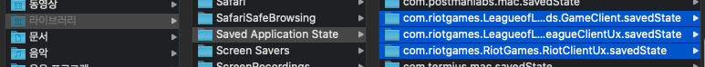 이제 동일한 방법으로 ~/Library/Saved Application State/ 로 이동 후 com.riotgames로 시작하는 파일들을 삭제해주도록 합니다.
