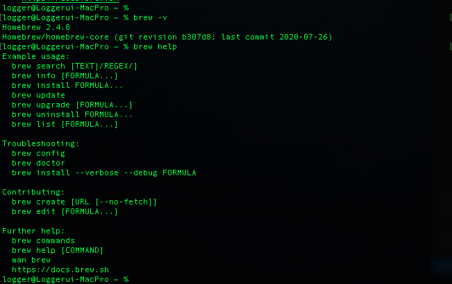 설치가 완료되었다면 $ brew -v 와 $ brew help로 버전과 도움말을 확인할 수 있습니다.
