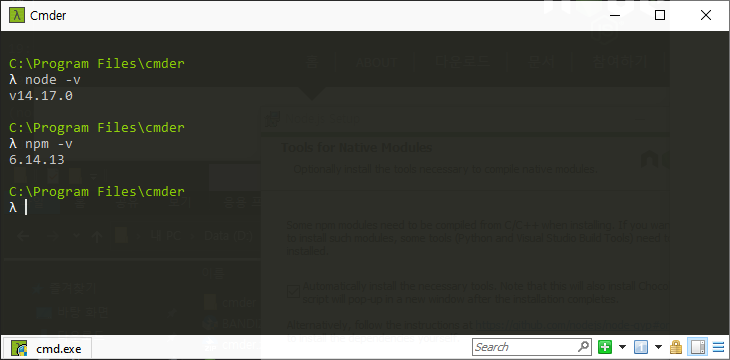 이제 확인 방법으로 node -v / npm -v 를 통해 설치된 node와 npm의 버전 확인이 가능합니다.