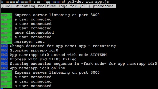 PM2 에서 지원하는 개발자 모드를 이용하는 방법 입니다. 파일 변경 및 로그를 실시간으로 보여 주고 파일 변경시 변경을 감지하여 자동으로 재시작 해줍니다.