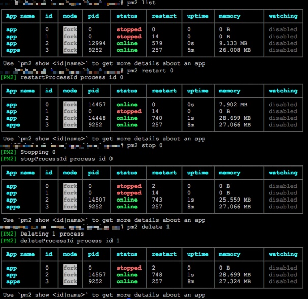 종료는 pm2 stop id 혹은 pm2 kill 로 해당 프로세스를 종료하거나 pm2 자체를 종료할수도 있습니다.