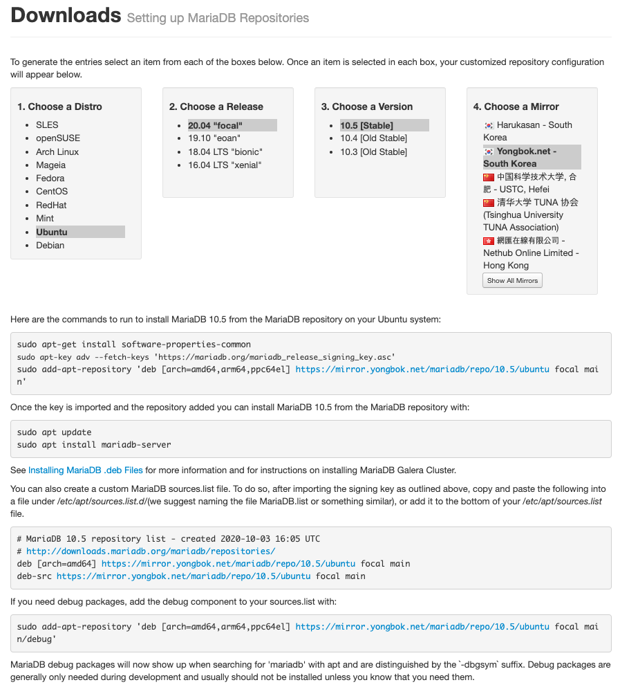 일단 설치 방법은 링크 ( downloads.mariadb.org/mariadb/repositories/#distro=Ubuntu ) 에서 확인 가능합니다.