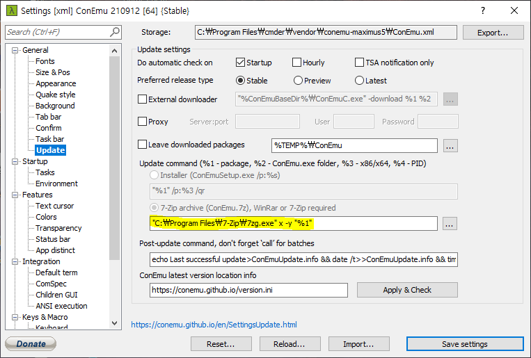 이제 general > Update로 이동 후 7-zip의 경로를 확인해 줍니다. 만약 따로 경로를 지정하지 않았다면 Apply & Check 로 적용이 가능합니다. 만약 필요하다면 설치를 진행한 경로로 설정한 후 Apply & Check 를 해주시면 됩니다.