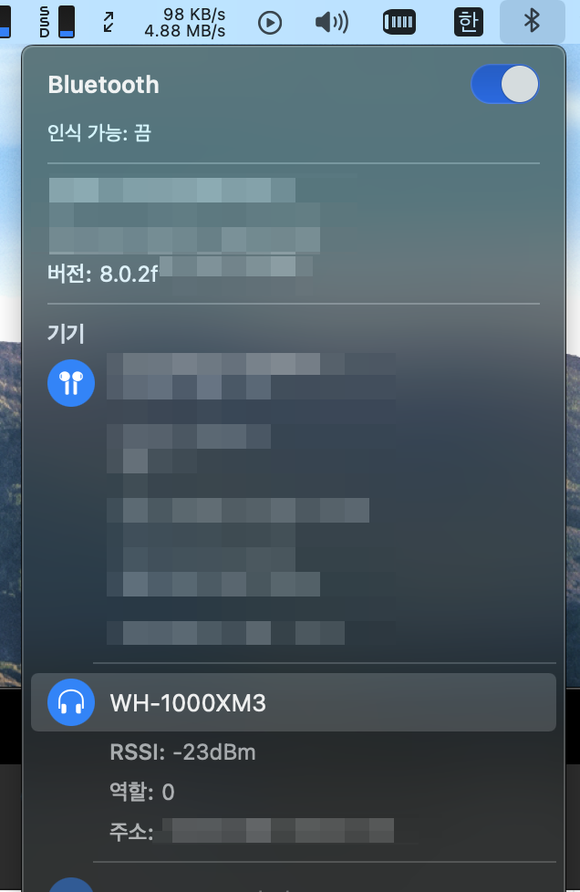 이 글에서는 간단히 MAC 에서 블루투스 오디오 장비를 사용시 오디오 코덱을 확인 하는 방법 및 AAC 혹은 aptX 코덱을 강제로 이용하게 하는 방법을 알아 보겠습니다. 위는 얼마전에 구입한 WH-1000X