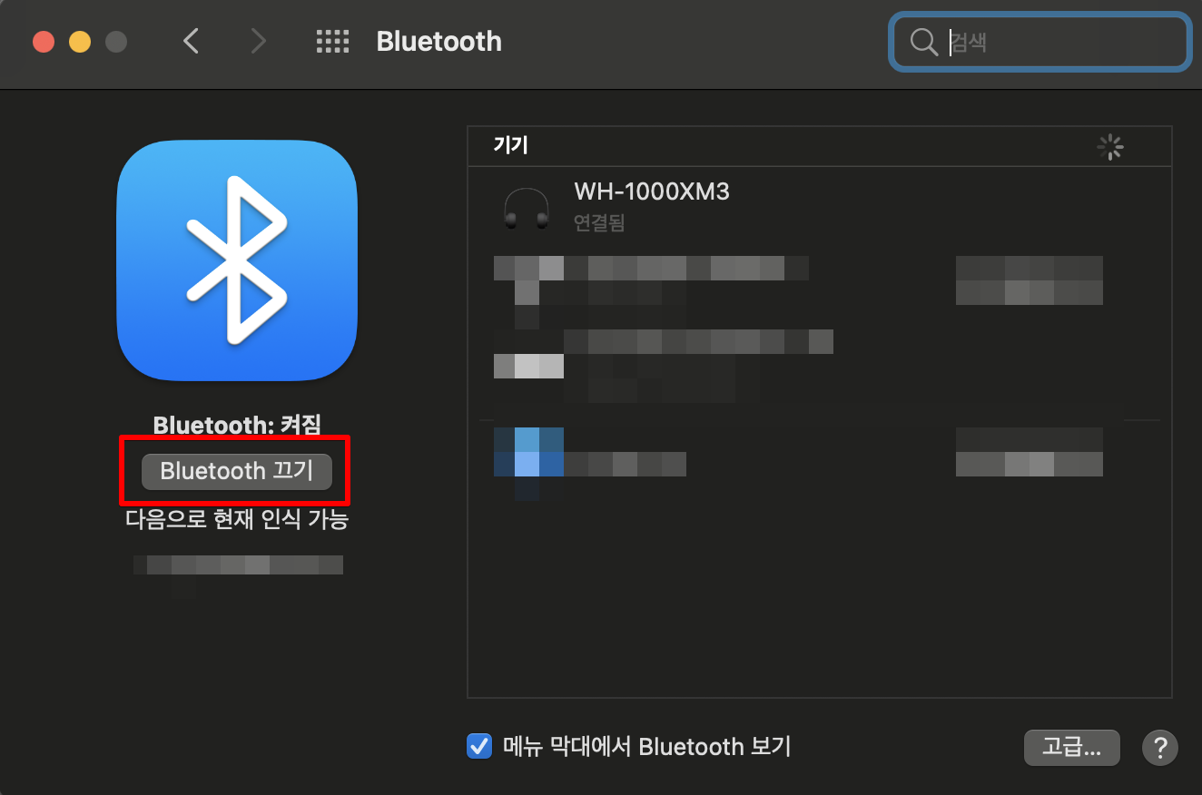 * Bluetooth (블루투스) 메뉴바에서 스위치를 껐다가 올리시거나